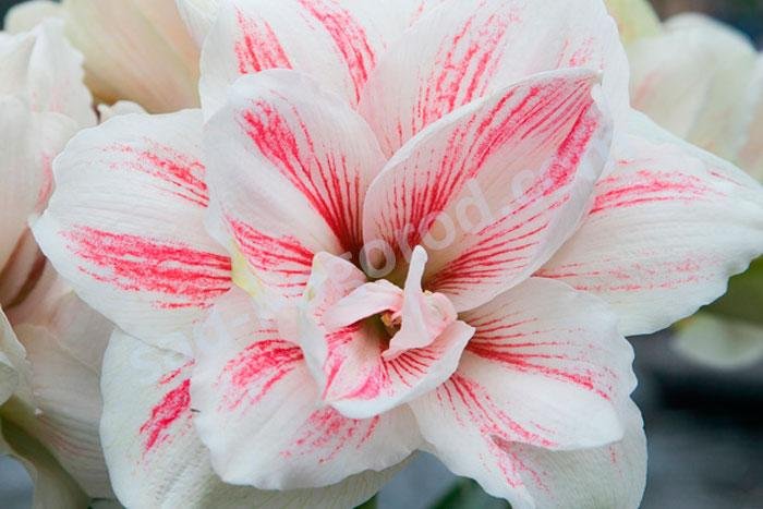 Гиппеаструм Акуаро. Высота растения 45-50 см. Цветок махровый, диаметром до 18-20 см. Крупные кремово-белые цветки с окрашенными в малиново-розовый жилками (насыщенность окраски зависит от условий выращивания), ближе к центру розовые полосы сливаются в розовые мазки. На каждой стрелке по 4-5 цветков.