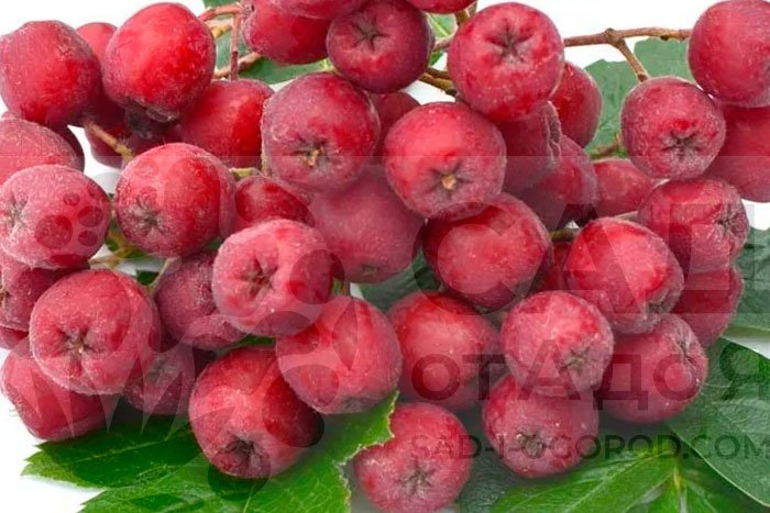Рябина Титан. Дерево среднерослое высотой 3-5 метров, с округлой кроной средней густоты, ветви и побеги прямые, коричневые, тусклые. Листья темно-зеленые, простые, с зубчатым краем, по форме напоминают листья груши. Осенью листва приобретает невероятно яркие оттенки: от оранжево-красных до насыщенно-багряных.