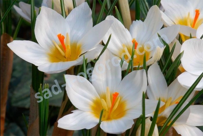 Крокус золотистоцветковый Сноубантин. Такой крокус обычно вырастает до высоты 10 см. Он великолепен благодаря своим цветкам, по окраске напоминающим слоновую кость. При этом серединка цветов представлена в золотистом цвете с уникальными сиреневыми штрихами. Выгодно контрастируют с белыми лепестками яркие оранжевые тычинки. Диаметр цветка 8 см. Оптимальные условия выращивания – солнечное местоположение и плодородная, рыхлая земля. Полива не требует. Морозостойкость высокая, зимует без укрытия.