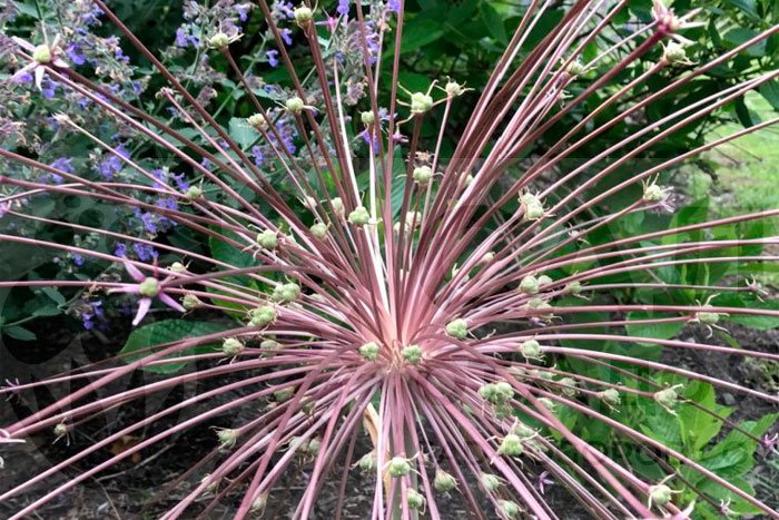 Аллиум Шуберта. Главная отличительная черта этого вида — уникальное, рыхлое зонтичное соцветие, которое выглядит как взрыв звезд.