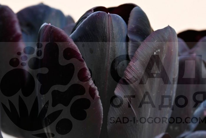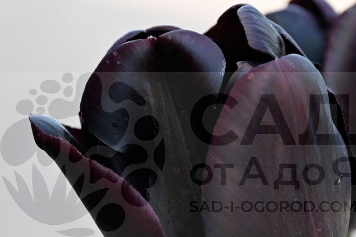Бутон крупный, бокаловидной формы, который по мере роспуска может немного раскрываться, становясь чашей. Цвет глубокий, бархатистый темно-бордовый, почти черный с внутренней стороны. Снаружи лепестки могут иметь легкий сероватый или сизый налет, что усиливает "готический" эффект. На солнце может отливать темной вишней. Цветет поздно, в мае, когда большинство тюльпанов уже отходят, что продлевает общий период декоративности сада.
