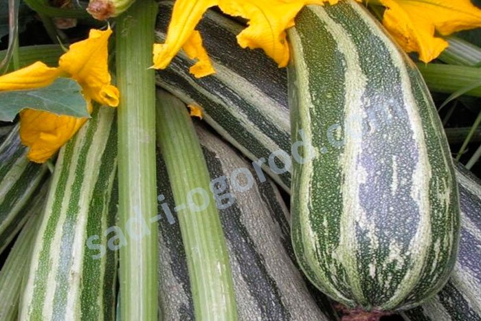Плод имеет правильную цилиндрическую форму, слаборебристые, светло-зеленые с широкими темно-зелеными продольными полосками, массой 0.9-1.1 кг. Поверхность ровная, слаборебристая с небольшим семенным гнездом. Длина кабачка составляет 15–20 см. Кожица тонкая, но плотная. Благодаря чему отлично переносит транспортировку. Не страшны кабачкам Зебра даже длительные поездки – они выдержат экспортные перевозки. Мякоть сочная, белая с желтоватым оттенком. Вкус ее слегка сладковатый.