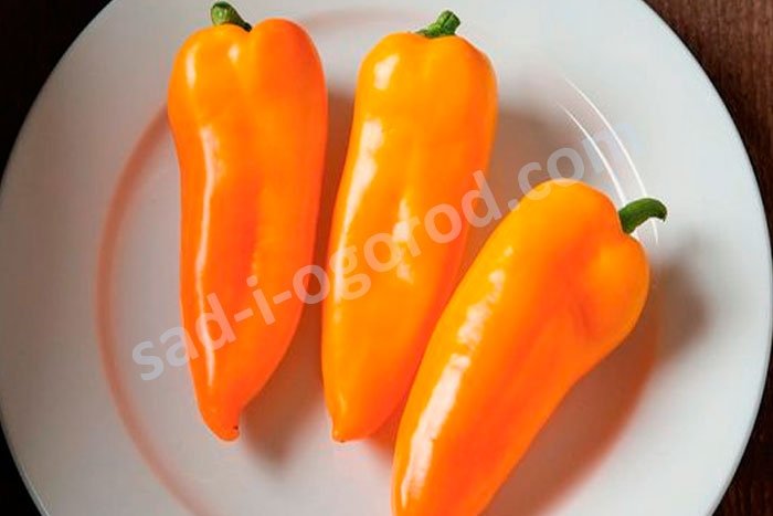 Раннеспелый. Период от полных всходов до технической спелости 112 дней. Растение полуштамбовое, раскидистое, среднерослое, среднеоблиственное, высотой 75-95 см. Лист среднего размера, зеленый. Положение плодов на растении смешанное. Плод крупный, конусовидный, гладкий, в технической спелости зеленый, в биологической - оранжевый. Число гнезд 2-3. Масса плода 90-110 г, толщина стенки 6,0-6,5 мм, вкус хороший. Товарная урожайность 3,0-3,7 кг/кв.м (до 7,0 кг/кв.м).