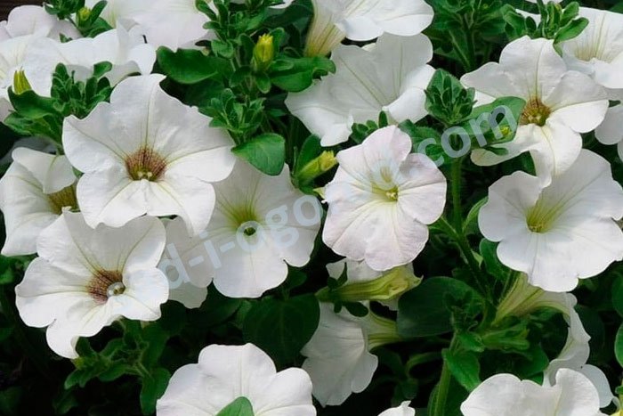 Сурфиния. Данные гибриды обладают повышенной выносливостью и устойчивостью к неблагоприятным погодным факторам, обеспечивая раннее, продолжительное и обильное цветение (с мая до осенних холодов). Цветки, расположенные по всей длине побегов, имеют средние (диаметром 5-6 см) или крупные (диаметром 8-10 см) размеры. Их форма в основном классическая в виде «колокольчиков» или «граммофонов» с гладкой поверхностью и краями. Цветы могут быть махровыми или бархатными, по окрасу преимущественно белыми, синими и розовыми. Семена в них созревают в очень малых количествах либо не завязываются совсем, поэтому основной способ размножения – вегетативный, с помощью черенкования. Корневая система сурфинии очень мощная. Для ее полноценного развития при выращивании в индивидуальных контейнерах субстрата на одно растение требуется объемом не менее 8 литров.